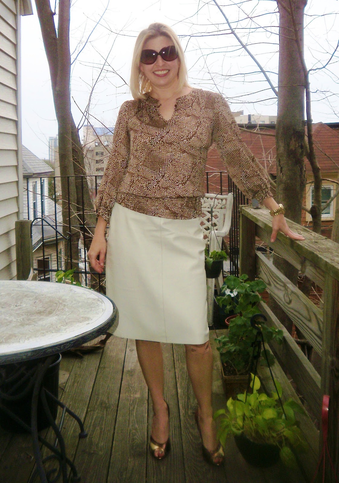 With a title like "Leather and Snake", weren't you expecting something a little bit more rock and roll than this outfit? I guess it goes to show that even something as sexy as a leather skirt and a snake print blouse can look conservative, if you wear it the right way! I wore this outfit to a political event where I needed to look pulled together. The color and cut of the leather skirt make it more business-like than, say, a red, tight mini (I suppose the same could be said for any skirt, not just leather!).